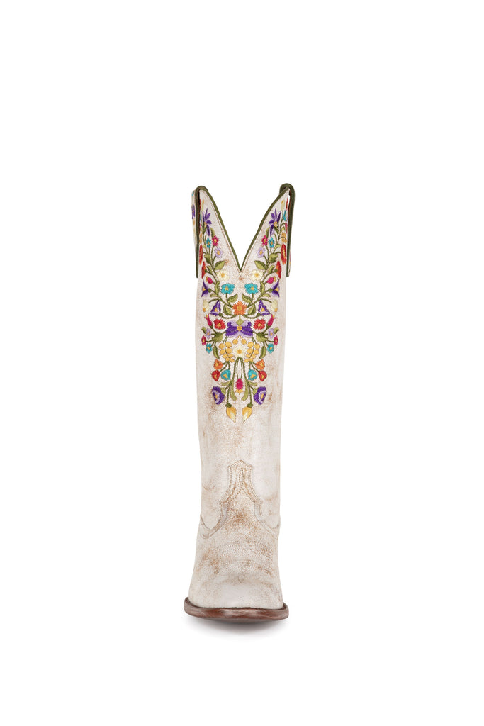 All the rage…this is one of our top sellers! This round toe white/multi-color boot is made of goat leather (vamp and 15”shaft). Features a 2” western heel with a leather sole. The embroidery at the top of the shaft and on the boot straps is beautiful (think floral bouquet).