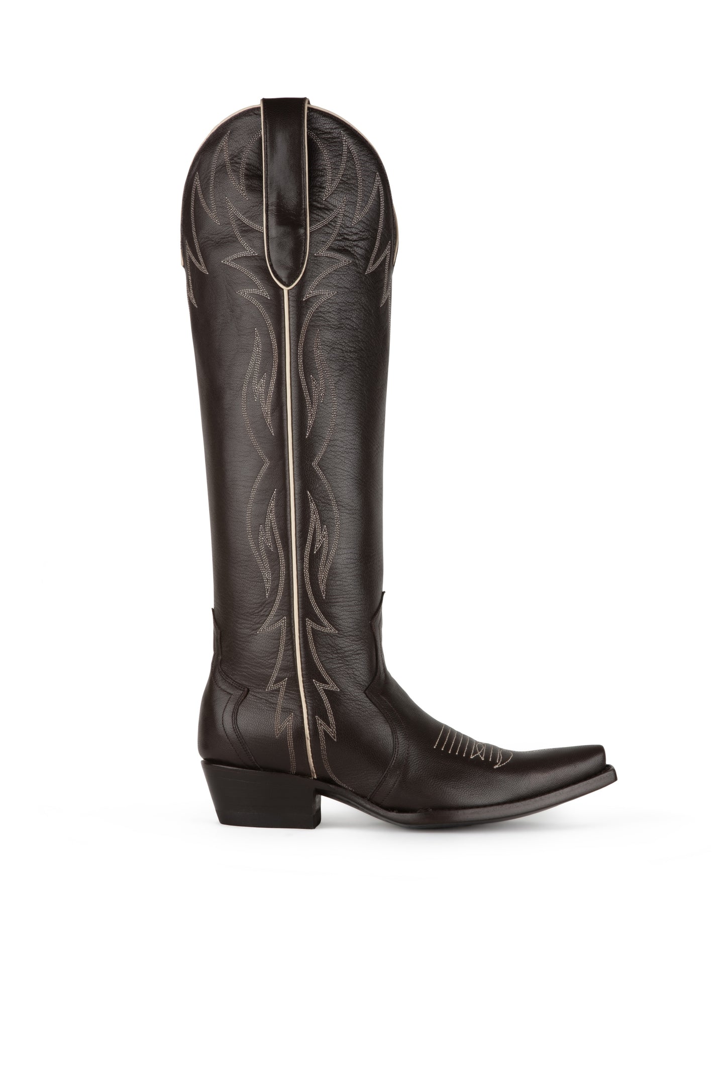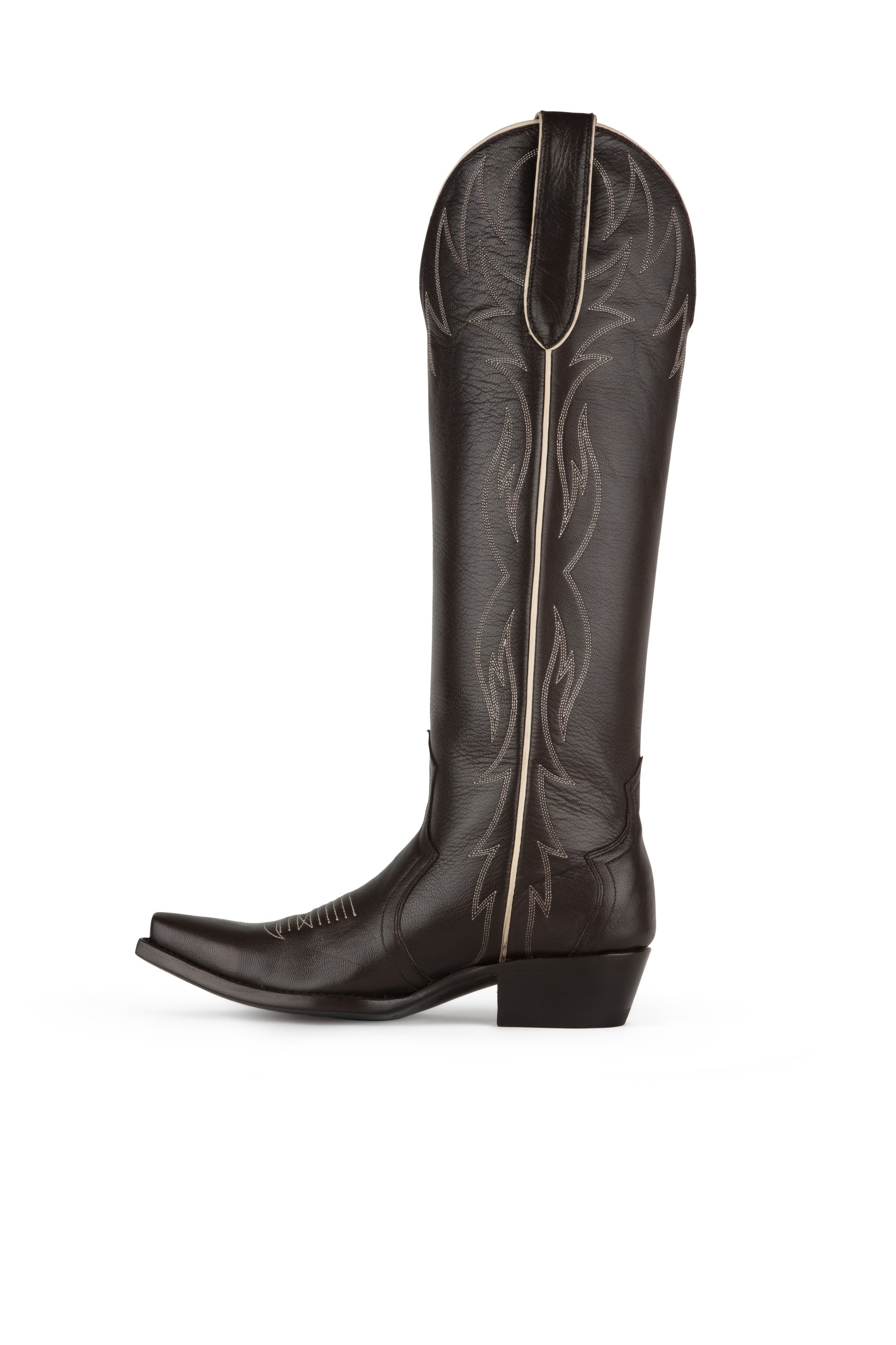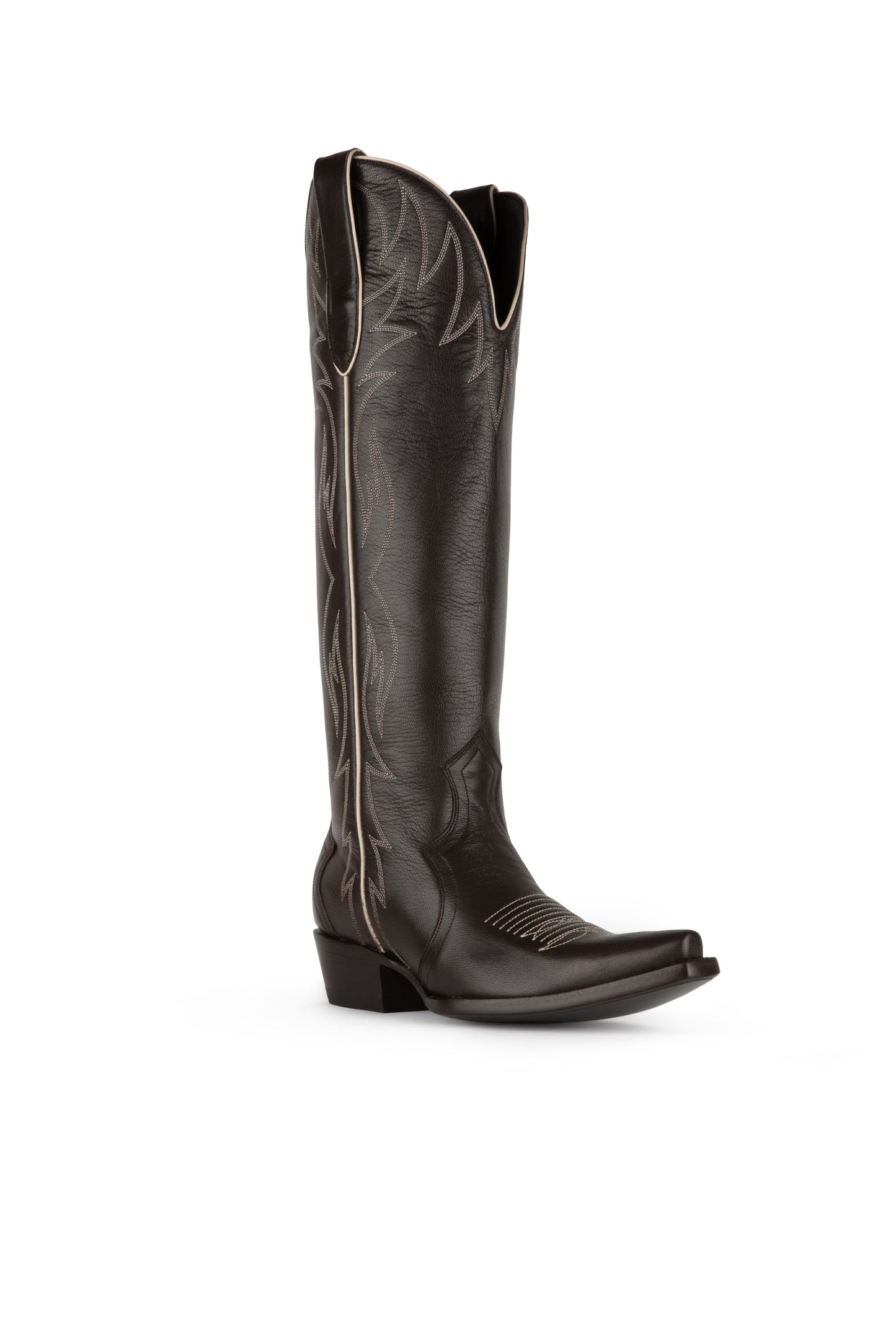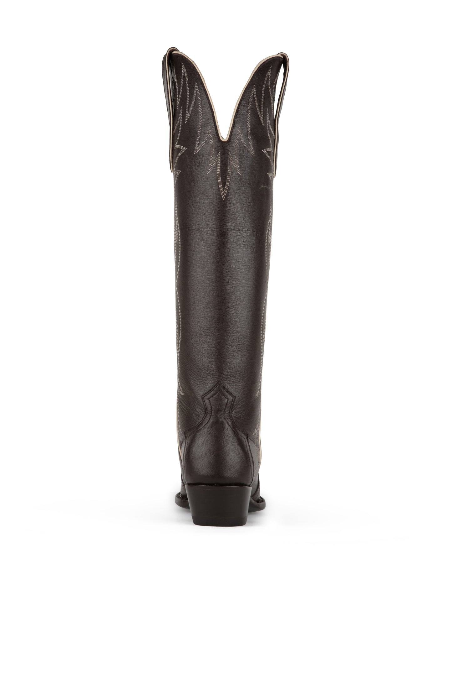 This stylish snip toe boot features color-matched piping and rising flame stitching on a tall 17” shaft. Made of goat leather with a 1-3/4 Western heel and a leather sole.