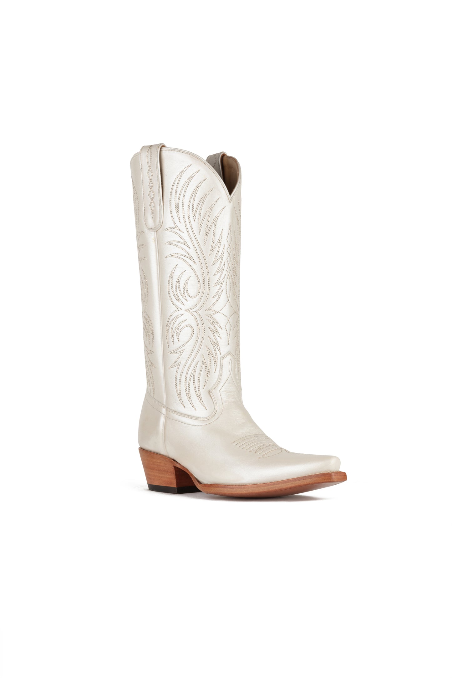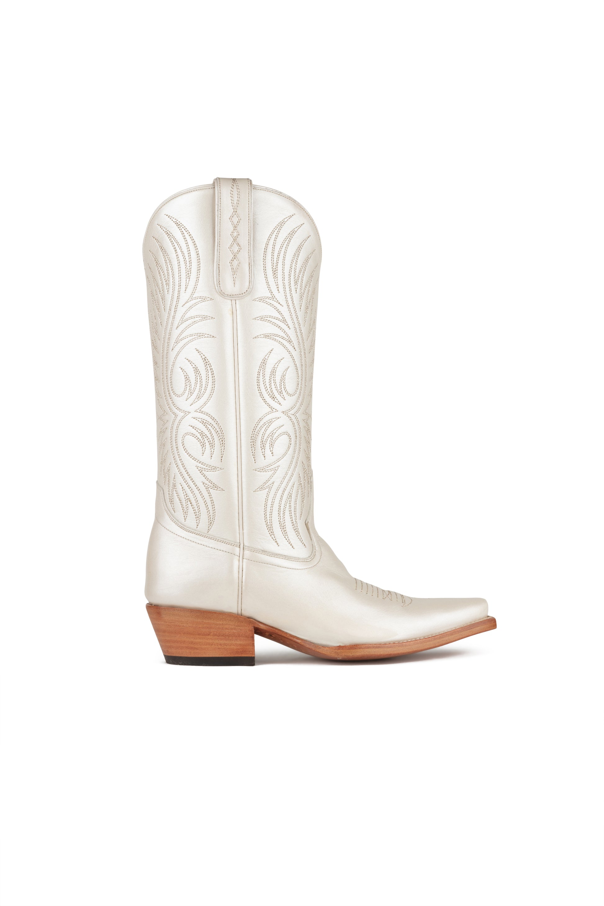 A stylish twist on a beloved classic. This goat leather boot features a color matched peacock feather stitch pattern and toe medallion on our traditional snip toe. It has a 1-3/4 “ Western heel and leather sole.